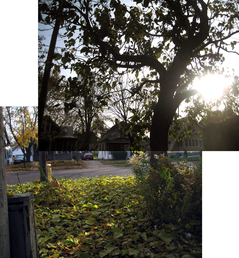 [The catulpa leaves fell off of the two catalpa trees in my front yard this morning. They always all fall off on the exact same day, and this year it was in the morning sunlight.]