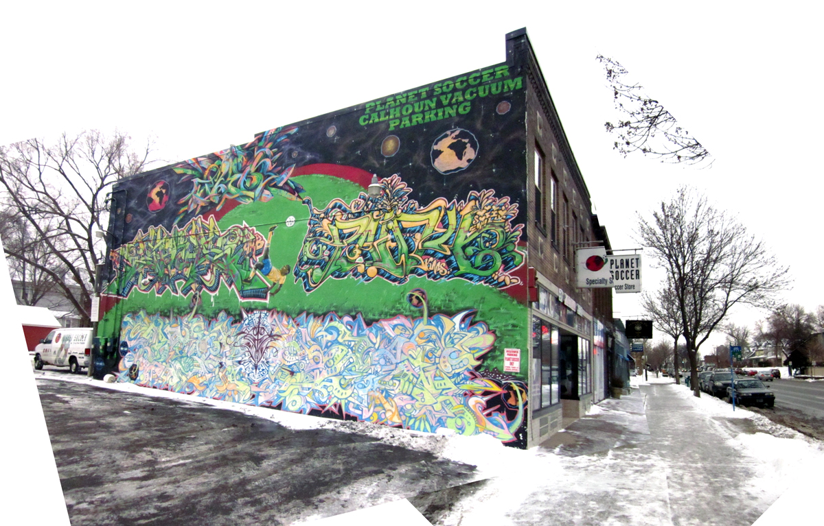 | [The awesome mural on the side of the old Vacuum and soccer ball store.] |