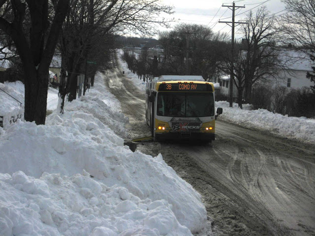 | [A bus climbing a snowy hill in Saint Paul.] |