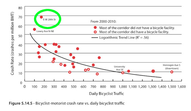 More alarmingly, 28th Street is the exact place that was identified as Minneapolis's most dangerous spot for bikes in the city's excellent crash report released earlier this year. 28th was almost off the chart of bike accidents: